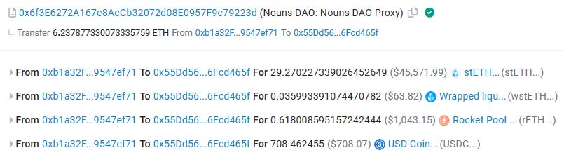 Below you can see a screenshot from EtherScan showing what the new treasury gets for each Noun added to the escrow. The new treasury already holds almost $19 milion in ETH and tokens.