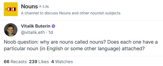 It seems Nouns have caught the eye of the Ethereum legend Vitalik as he asked a question about Nouns in the Nouns channel on Farcaster: